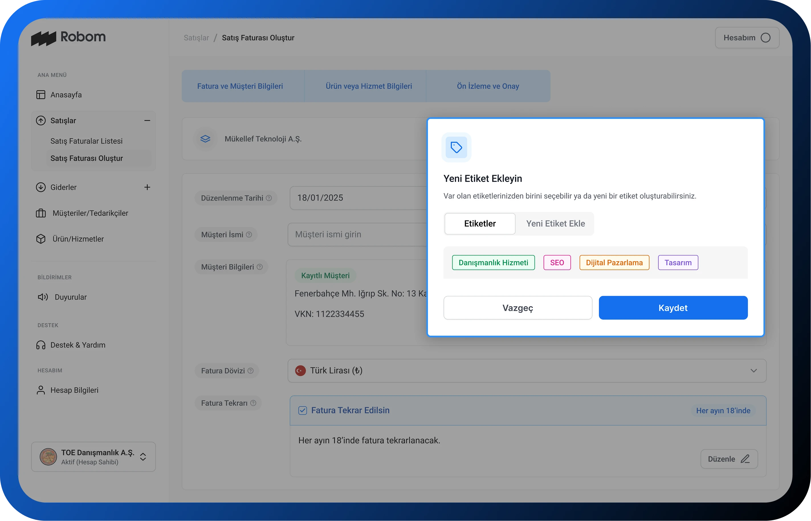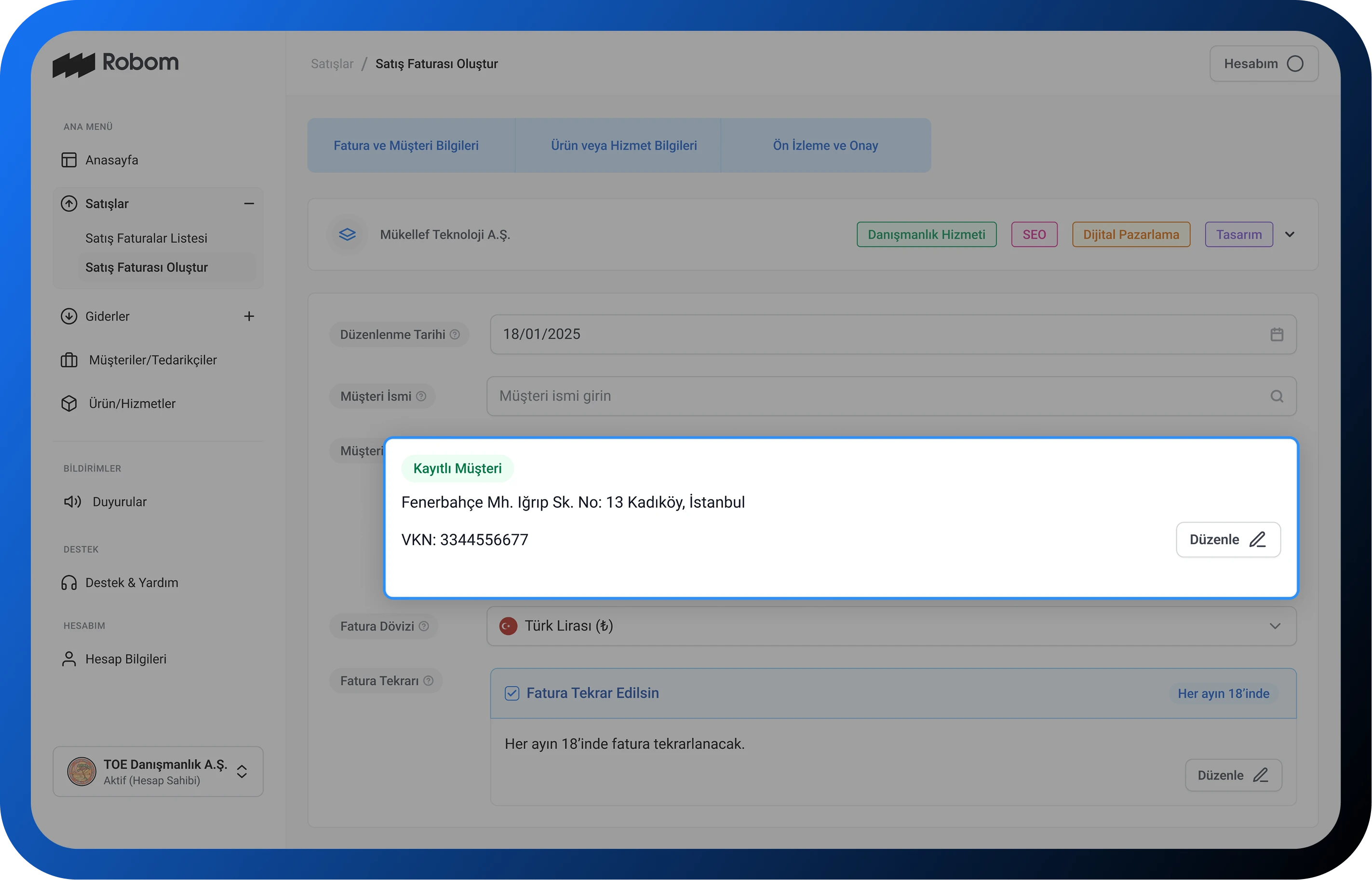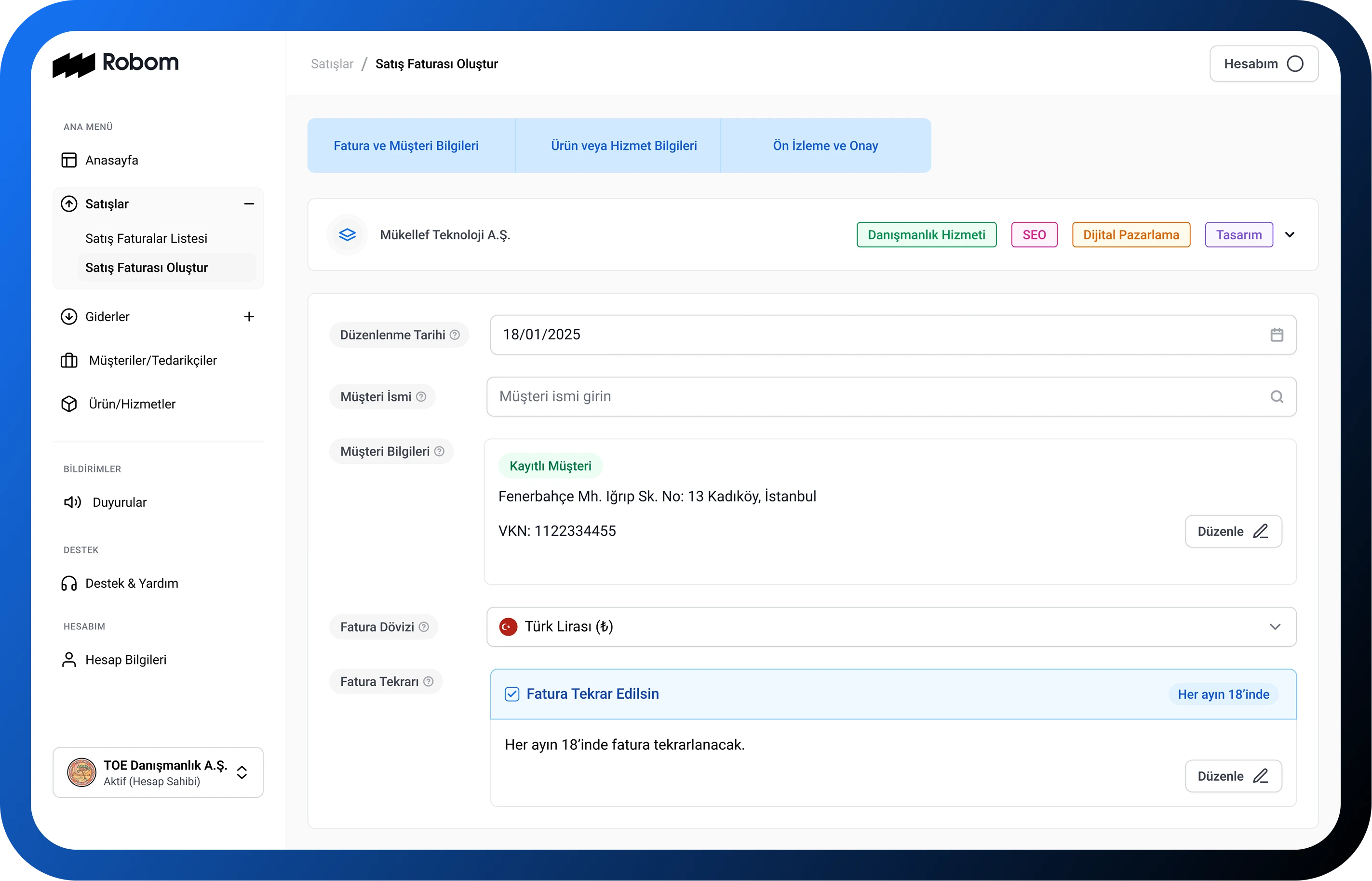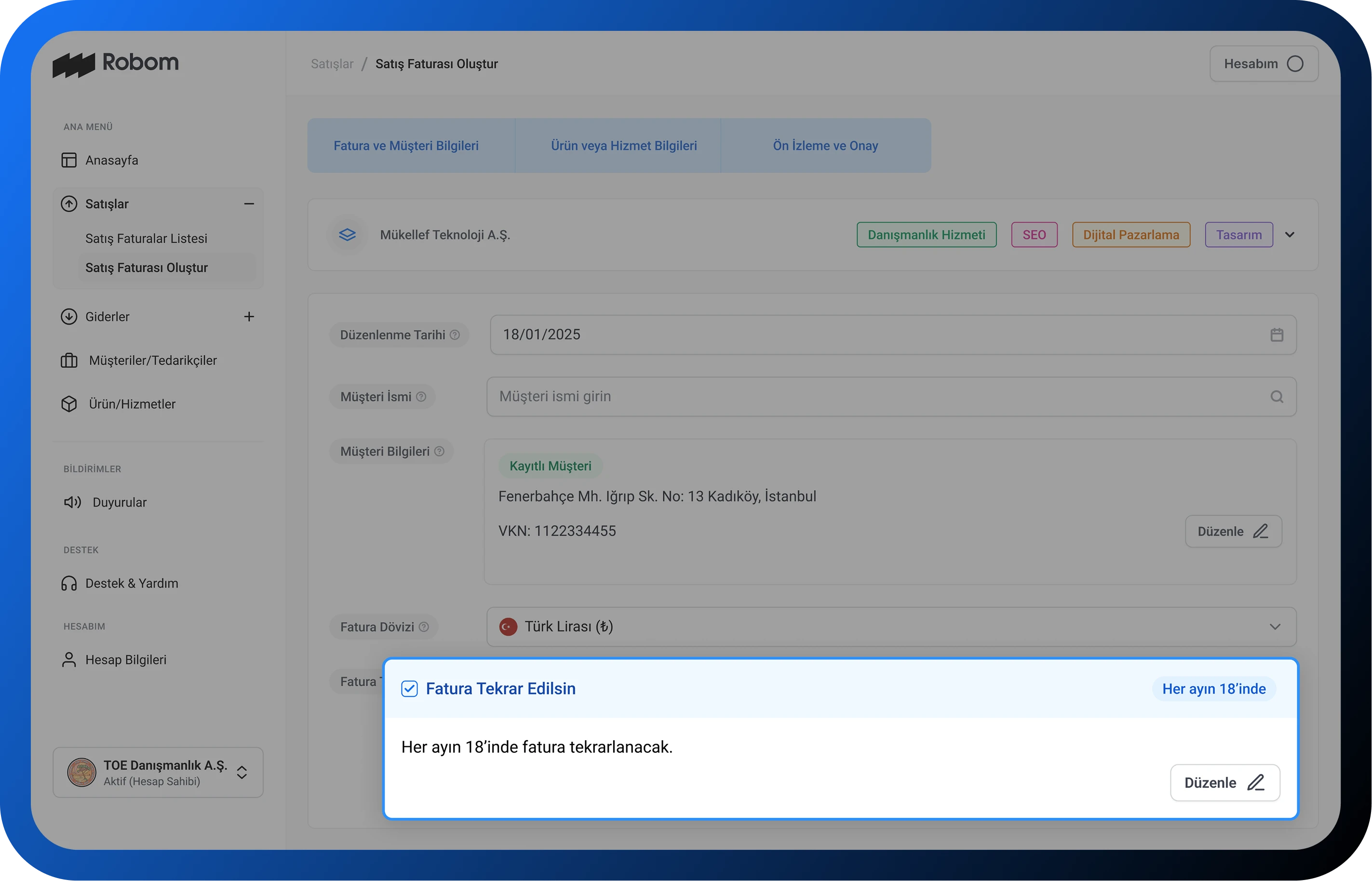 Her ay kestiğiniz faturaları otomatiğe bağlayın. Siz işinize odaklanırken, Robom zamanı geldiğinde faturalarınızı otomatik olarak oluşturup göndersin.